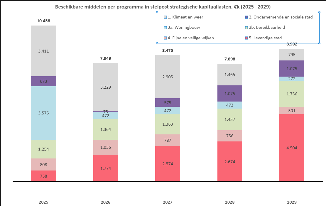 We sparen voor het structurele deel van strategische investeringen via de structurele stelpost strategische kapitaallasten (SSKL). Onderstaande grafiek laat de ruimte per thema uit het bestuursakkoord zien na aftrek van de in onderstaande tabel opgenomen toewijzingen. Hierbij is rekening gehouden met de intensiveringen voor klimaatopgave (oplopend naar 1,3 miljoen), BIC Noord (1,0 miljoen), masterplan mobiliteit (0,7 miljoen), convenant Beethoven (1,0 miljoen) en voorzieningen (2,7 miljoen); in hoofdstuk 4.3 is een nadere toelichting opgenomen hoe de gespaarde middelen zijn verdeeld over onderliggende onderwerpen.