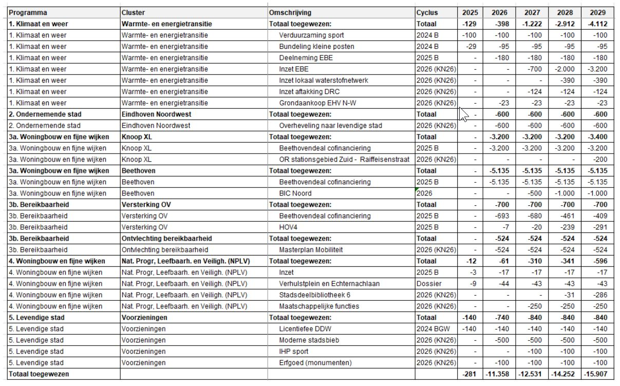 Energie | 2026-2030 | 3,2 | Aanleg van energie infrastructuur, zoals warmtenetten ten behoeve van een duurzame energietransitie in de stad. Voor de eerste investeringen vanuit Eindhoven Energie BV is dekking. Vanaf 2027 wordt opnieuw gekeken naar dekking voor nieuwe ontwikkelingen. | Vaststellen warmtekavels volgens het warmteprogramma Investeringen conform startportefeuille en aanvullend ontwikkelportfolio van Eindhoven Energie BV |